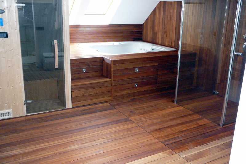 Sigurnost... Drvo oko untarnjeg bazena ili u kupaonici u kombinaciji s gumom čini podlogu koji se ne skliže. Ne morate više ugrađivati razne prostirke u kupaonicu. Uz to, one nisu niti lijepe.